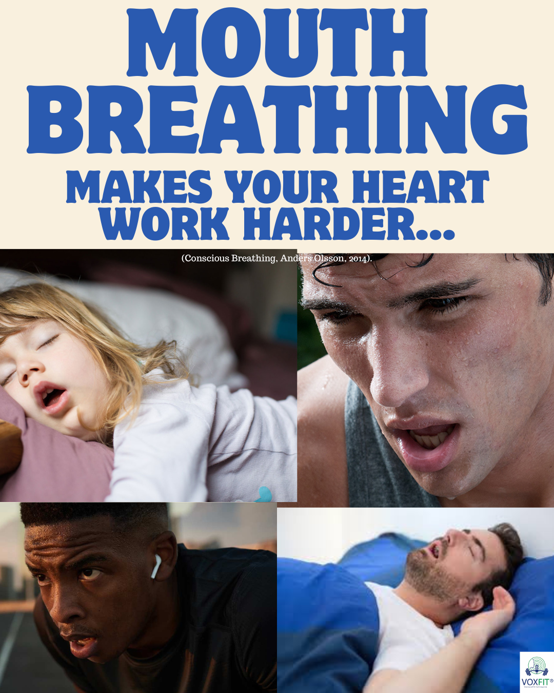 Recent research shows that nitric oxide (NO) increases the amount of oxygen (O2) transferred from inhaled air into your blood. You don’t get any NO down into your lungs when you breathe through your mouth, & consequently your heart is forced to work harder.